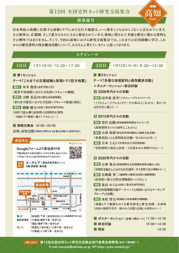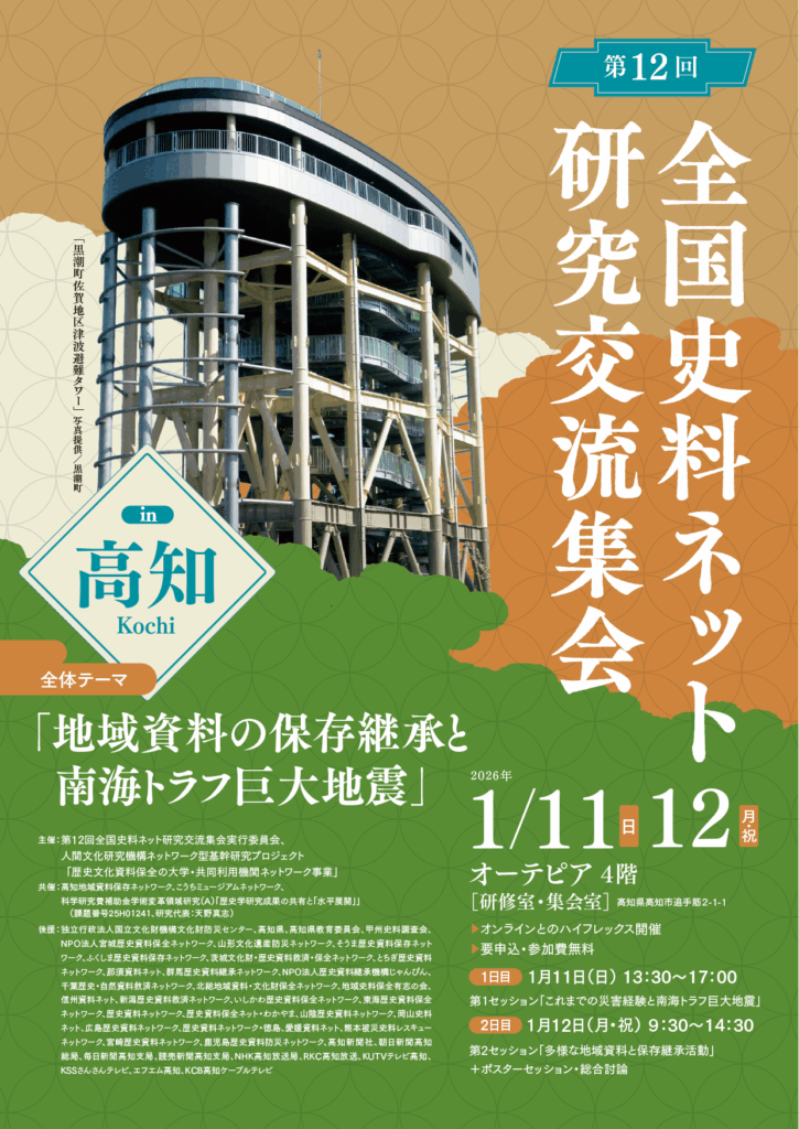 • 共催:高知地域資料保存ネットワーク、こうちミュージアムネットワーク、科学研究費補助金学術変革領域研究(A)「歴史学研究成果の共有と「水平展開」」(課題番号25H01241、研究代表:天野真志)